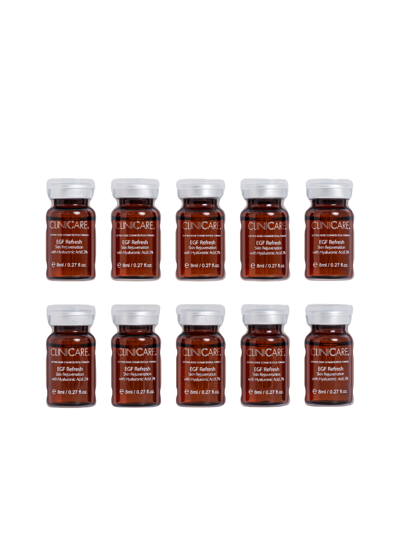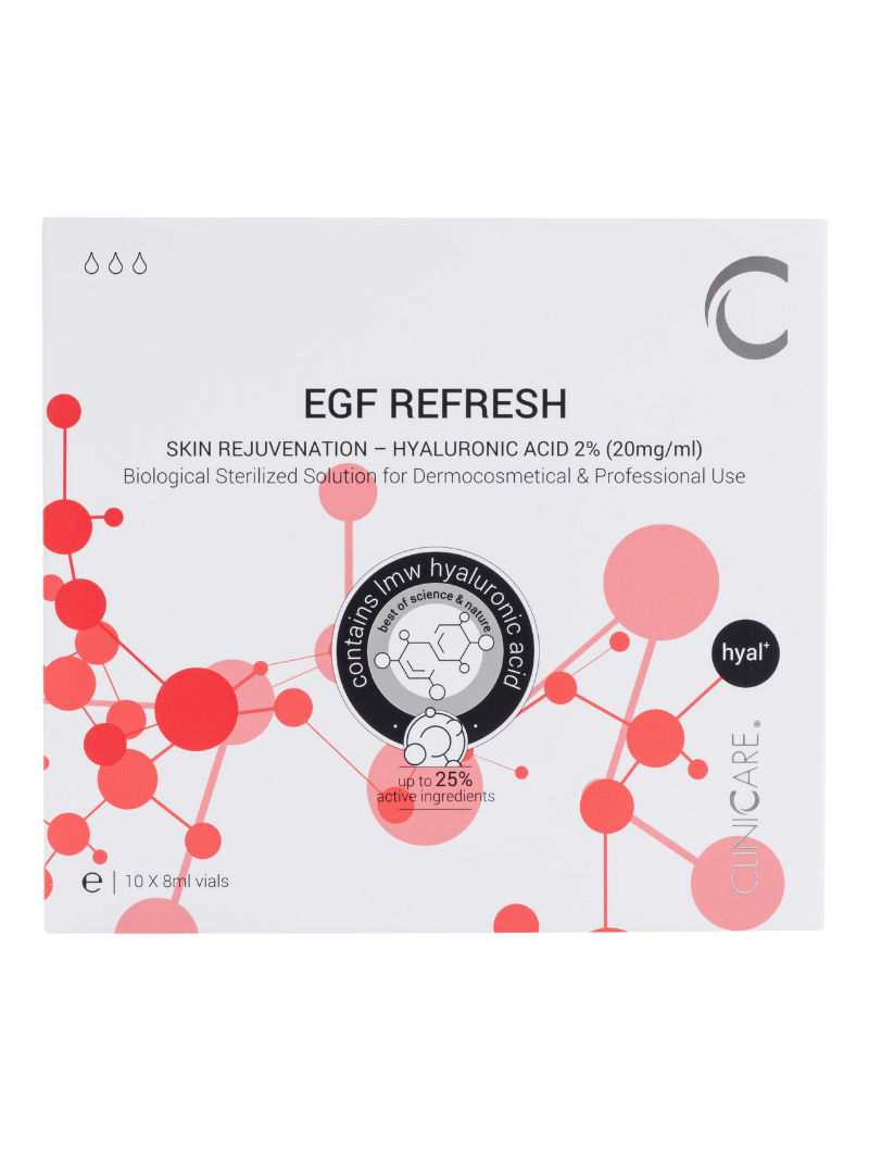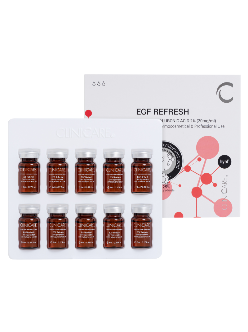 CLINICCARE® EGF REFRESH (2% HA) ist eine Mesotherapie-Ampulle zur Hautverjüngung mit intensiv feuchtigkeitsspendender und faltenreduzierender Wirkung. Sie enthält einen Wirkstoffcocktail aus verjüngenden, hydratisierenden, festigenden, straffenden und antioxidativen Inhaltsstoffen, die gemeinsam dazu beitragen, Feuchtigkeit und Festigkeit wiederherzustellen, die durch den Abbau von Hyaluronsäure und Kollagenfasern in der Haut verloren gegangen sind. Diese revitalisierende Formel fördert ein glatteres und strahlenderes Hautbild.